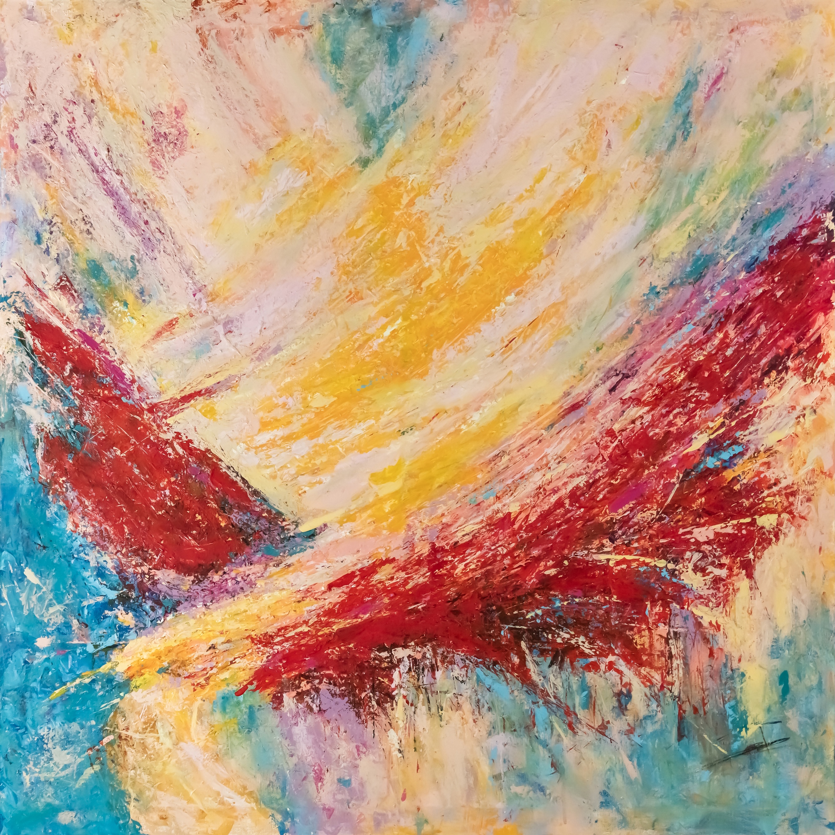 The inspiration for "Blossom 2" comes from Chu Teh-Chun's rhythmic and rhythmic lines; and the interweaving and movement of dots and lines, combined with the brightness and darkness of the light on the screen, create a melody that is like notes, with highs and lows. At the same time, the work drew inspiration from Andy Warhol's bold colors to create this artwork. This work highlights the color lines and uses abstract expression techniques to instantly fill the entire painting with color, creating a strong visual impact. This effect is created not only by the vibrancy of the colors but also by the irregular the combination between them, making the whole work full of vitality and dynamism. In this work, pigments are randomly distributed on the canvas using various scraping techniques, giving the colors a sense of randomness and unpredictability, showing excitement and exuberance.